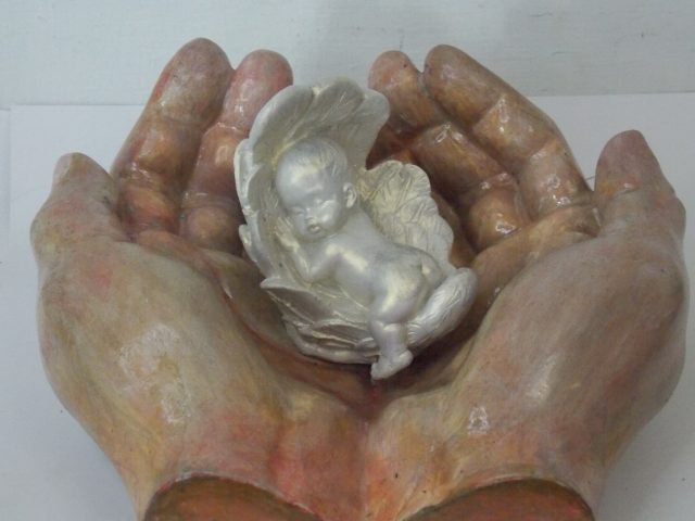 Взгляните на неё ближе: маленький ангелочек, с пухлыми щечками, словно только что проснувшийся от сладкого сна, уютно прижимается к мягкому, изогнутому крылу. Крыло — это не просто декоративный элемент, а символ нежной опеки, которое обволакивает кроху, словно объятия матери. Его перышки, проработанные с мельчайшими деталями, кажутся пушистыми и живыми — мастер вручную наносит каждый мазок, добавляя текстуру, которая манит прикоснуться. Ангелочек держит в ручках крошечный цветок или сердечко, символизируя чистоту и невинность новорожденного. Лицо его — воплощение мира и покоя: закрытые глазки, лёгкая улыбка, как будто он шепчет молитву о счастье для своей новой семьи.
