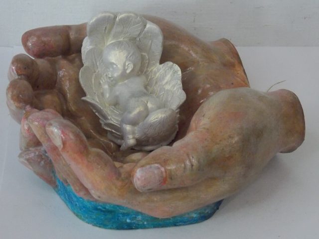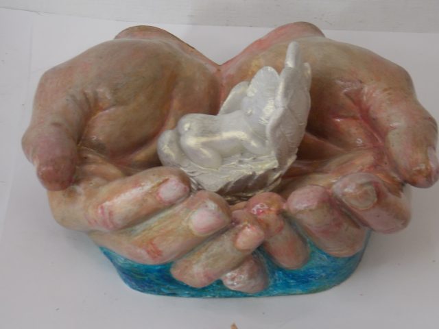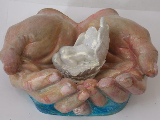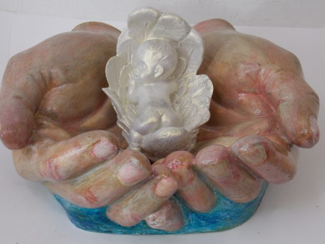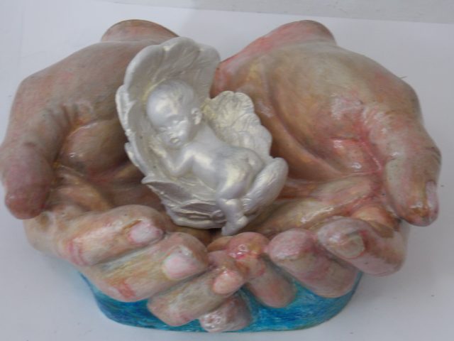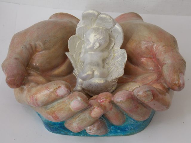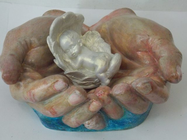 Взгляните на неё ближе: маленький ангелочек, с пухлыми щечками, словно только что проснувшийся от сладкого сна, уютно прижимается к мягкому, изогнутому крылу. Крыло — это не просто декоративный элемент, а символ нежной опеки, которое обволакивает кроху, словно объятия матери. Его перышки, проработанные с мельчайшими деталями, кажутся пушистыми и живыми — мастер вручную наносит каждый мазок, добавляя текстуру, которая манит прикоснуться. Ангелочек держит в ручках крошечный цветок или сердечко, символизируя чистоту и невинность новорожденного. Лицо его — воплощение мира и покоя: закрытые глазки, лёгкая улыбка, как будто он шепчет молитву о счастье для своей новой семьи.