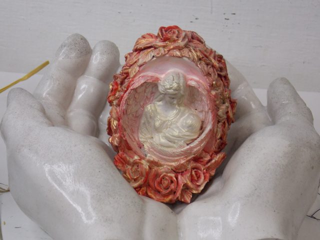 Фигурка выполнена в форме яйца — древнего символа жизни, возрождения и тайны. Яйцо здесь не просто форма: оно олицетворяет зарождение всего сущего, как и чудо рождения младенца. Внутри этого “яйца” нежно размещена Дева Мария, держащая на руках Своего Сына. Ее лицо — воплощение материнской любви и спокойствия, с мягкими чертами, выражающими бесконечную заботу. Младенец Иисус, с невинными глазами и крошечными ручками, символизирует чистоту и надежду, напоминая о чуде, которое меняет мир. А вокруг, словно венок из цветов, вьются розы — символы любви, страсти и вечной красоты. Эти розы не статичны: каждая лепесток вылеплен вручную, с тонкими прожилками и градиентом цветов — от нежно-розового до глубокого алого, — чтобы они казались живыми, только что сорванными в райском саду.