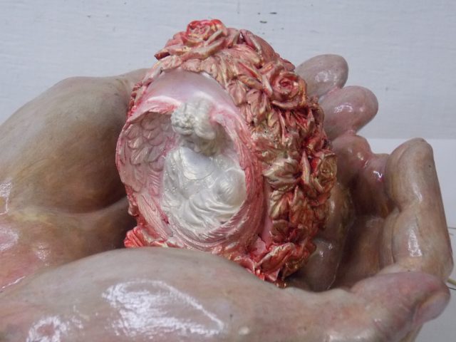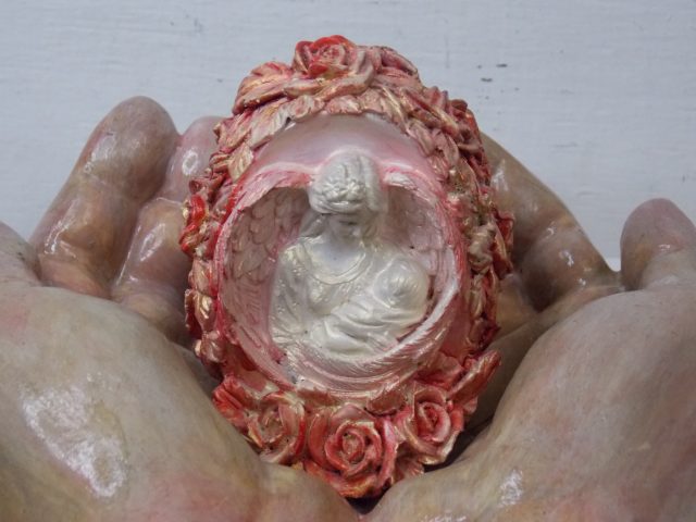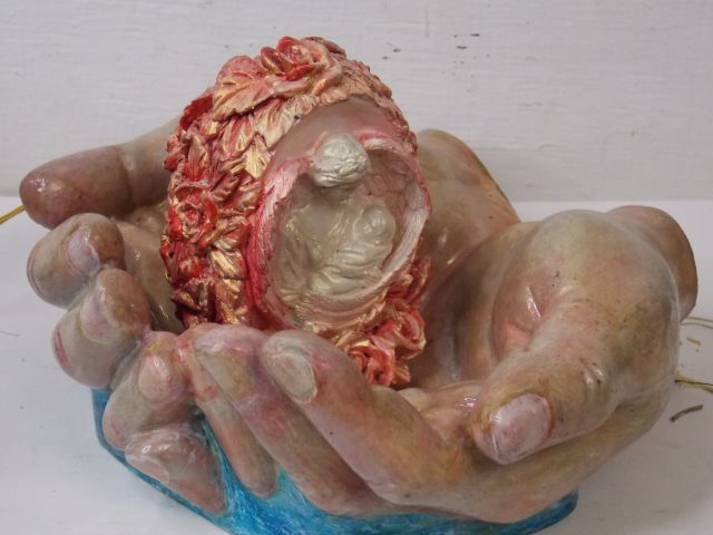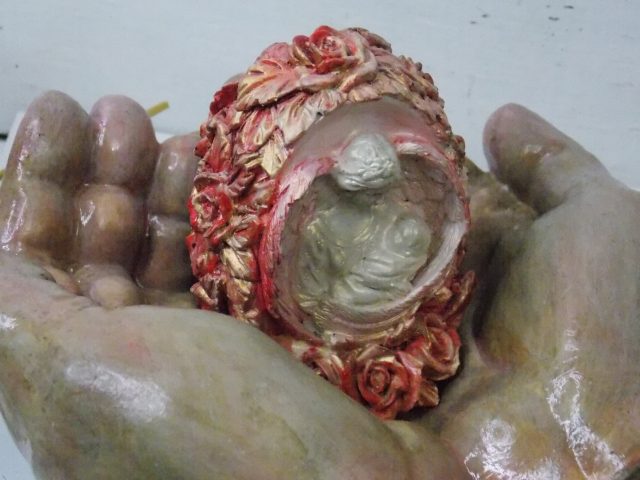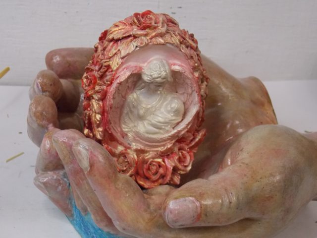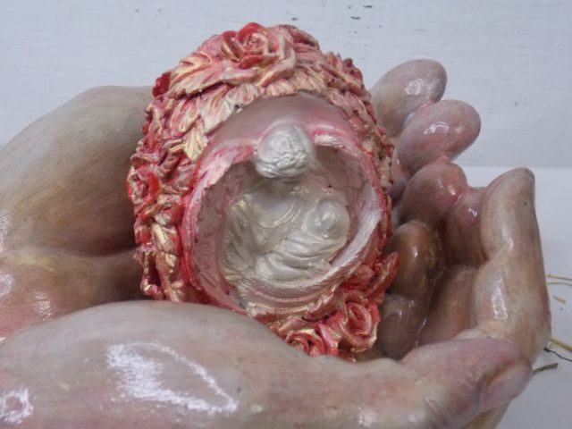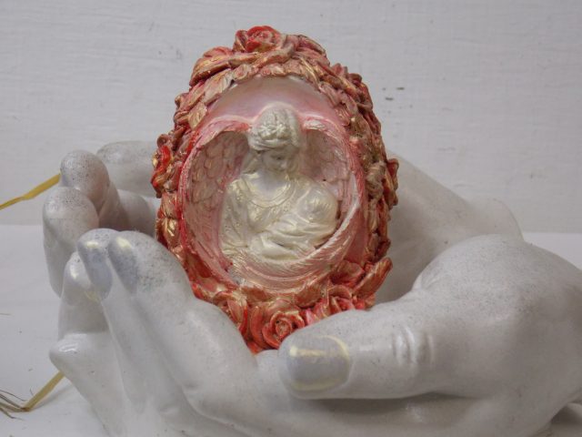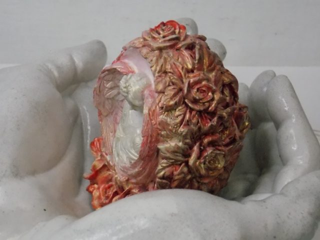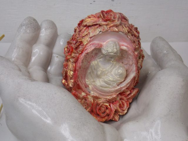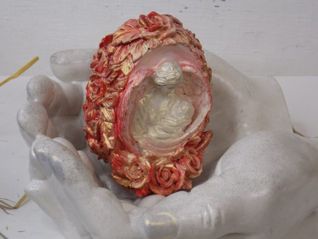 Фигурка выполнена в форме яйца — древнего символа жизни, возрождения и тайны. Яйцо здесь не просто форма: оно олицетворяет зарождение всего сущего, как и чудо рождения младенца. Внутри этого “яйца” нежно размещена Дева Мария, держащая на руках Своего Сына. Ее лицо — воплощение материнской любви и спокойствия, с мягкими чертами, выражающими бесконечную заботу. Младенец Иисус, с невинными глазами и крошечными ручками, символизирует чистоту и надежду, напоминая о чуде, которое меняет мир. А вокруг, словно венок из цветов, вьются розы — символы любви, страсти и вечной красоты. Эти розы не статичны: каждая лепесток вылеплен вручную, с тонкими прожилками и градиентом цветов — от нежно-розового до глубокого алого, — чтобы они казались живыми, только что сорванными в райском саду.