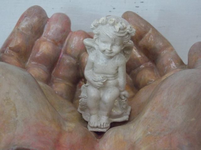 В Тюмени сувениры – Ангел с цветком на пеньке.