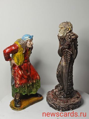 Фигурки сувенирные баба Яга и кашей бессмертный ,герои сказки ,в баба Яга из сказки Морозко ,в высоту 10.5 см кашей бессмертный в высоту 11.5 см.
